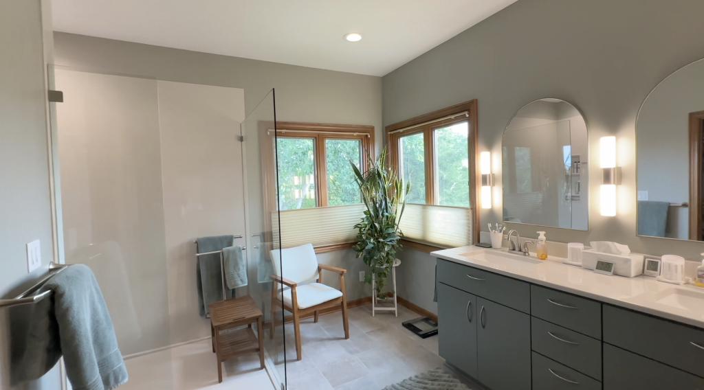 “The bathroom we had worked fine,” said Sally Cloar. “But… when we get old, we won’t be able to bend over as much. So a higher vanity, a higher toilet, and an easy in and out shower made sense.”